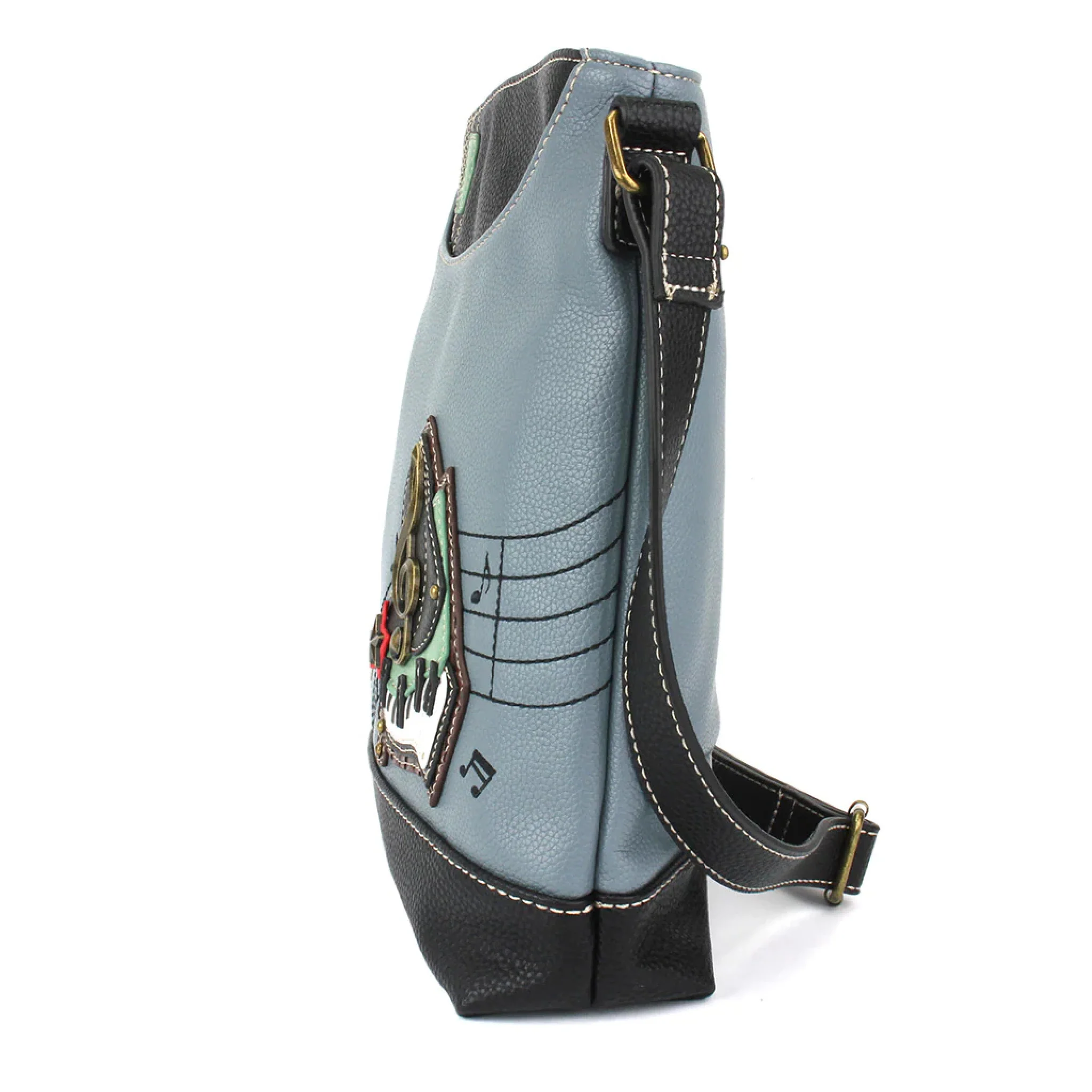 Adorned with a musical design, this faux leather messenger bag has plenty of room to keep you organized throughout the day, including a zippered main pocket and spaces on the front and back of the bag. Measures approximately 10” x 11” x 3” with an adjustable strap.